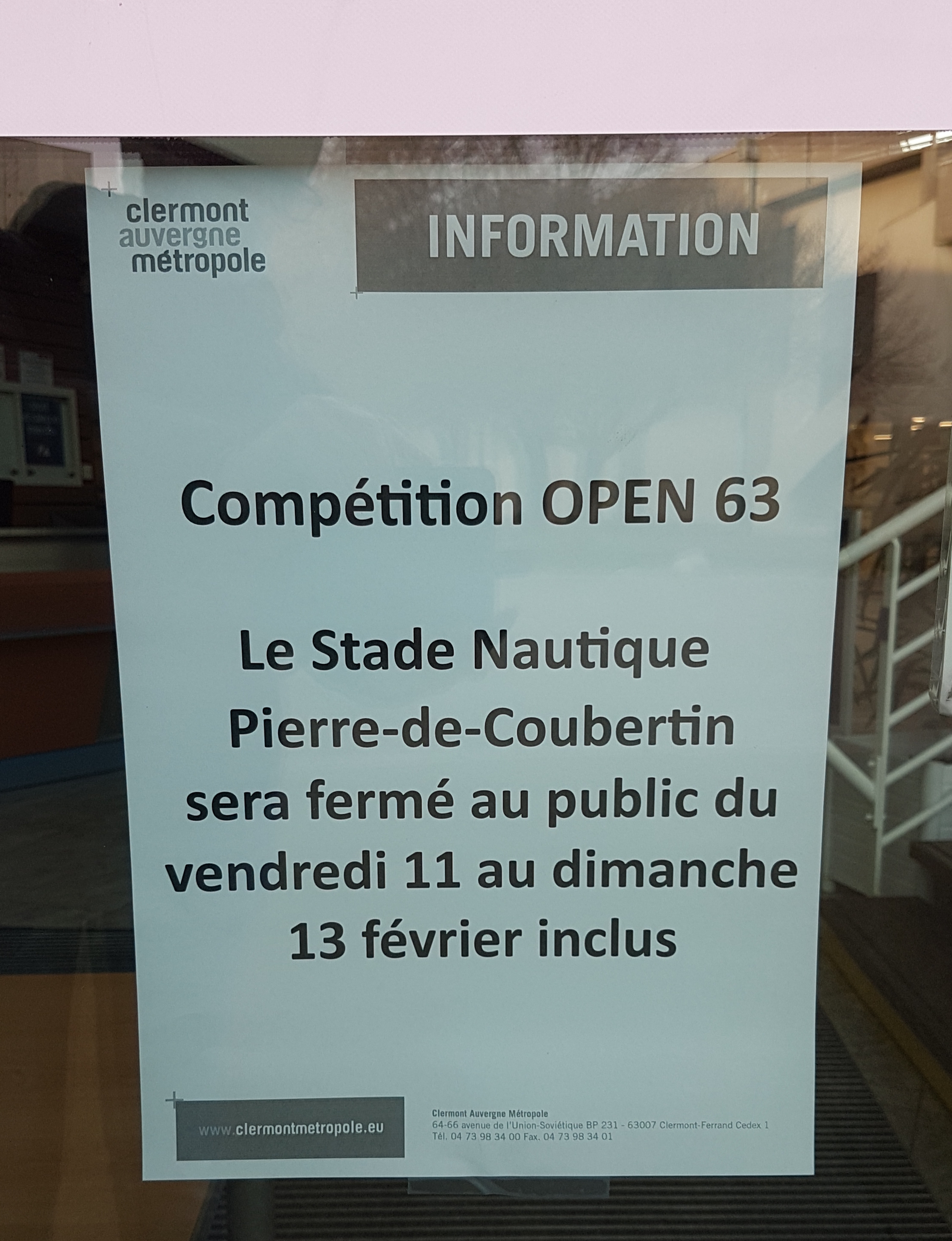 Attention. Compétition du 11 au 13 février. Et ensuite la piscine sera fermé pour cause de vidange bassin, la réouverture se fera le 28 février.